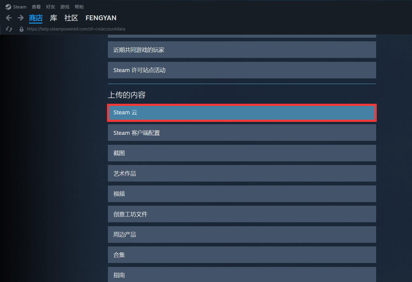 幫助>>steam客服>>我的賬戶>>您steam賬戶的相關數據>>steam雲