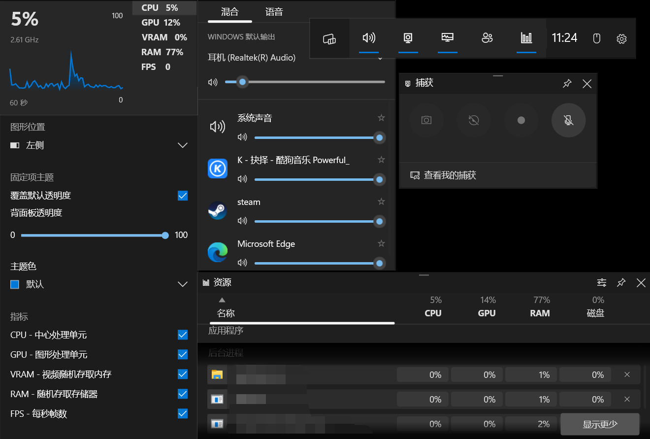 最後,一般電腦自帶有Xbox Game Bar(默認快捷鍵爲 Windows 徽標鍵 + G),可以對遊戲實時幀數顯示,系統任務查看,錄屏選擇等