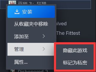 庫>>選定遊戲右擊>> 管理>>隱藏此遊戲、標記爲私密