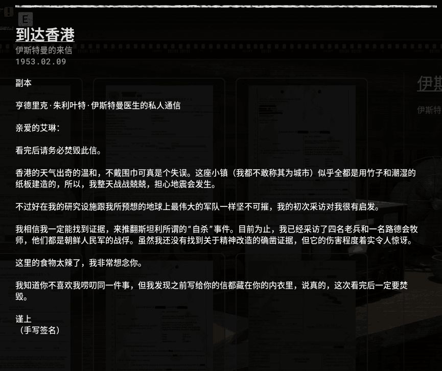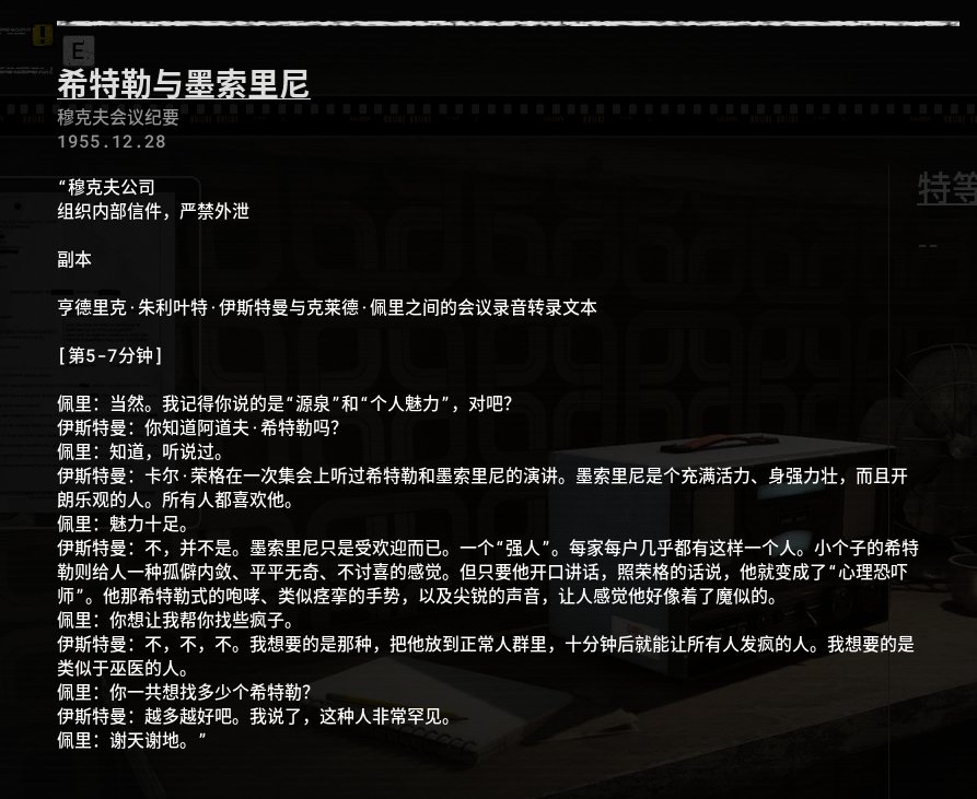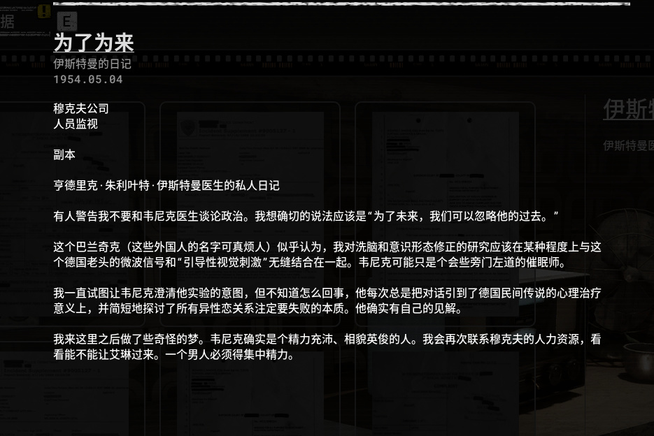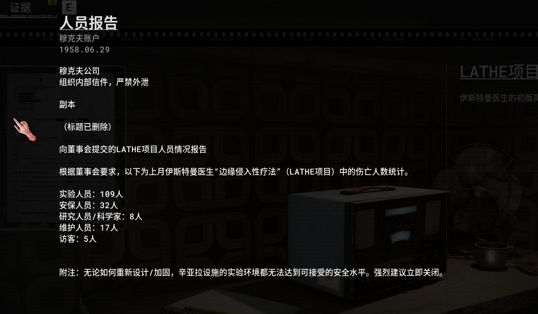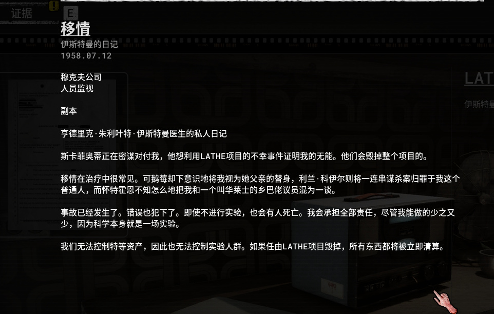 作爲實驗主導者的伊斯特曼無法坐視不管但是又無能爲力,他感覺大勢已去,自己即將被清算,公司內部也暗流湧動,有不少人樂於看見他被趕下臺。如果伊斯特曼真的在1958年被清算了,那也不會有Lathe2計劃的誕生,可能是上天被他的堅持感動了(呸),他發現了Lathe計劃對受試者產生了一定的作用,正是因爲這個發現,纔有了後面玩家們所面對的試煉,至於具體的內容我們等到Lathe2計劃再說吧。