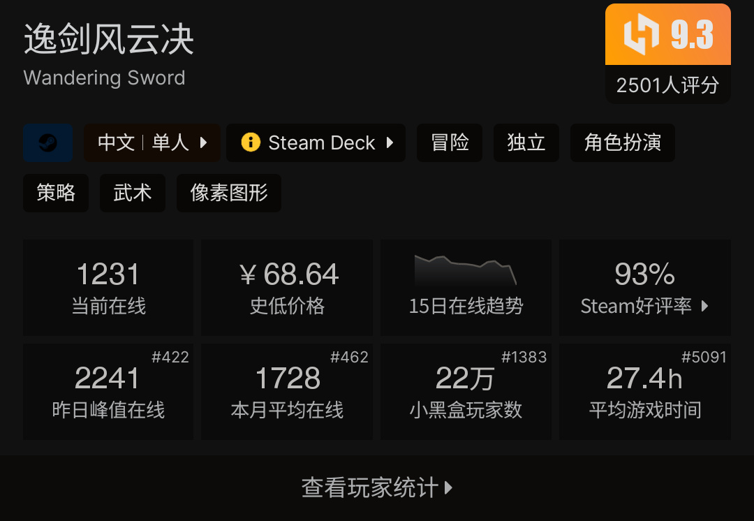 遊戲目前在小黑盒的評分高達9.3分,在一衆國產武俠遊戲裏可以算得上是一騎絕塵了,很多玩家在遊玩過以後也紛紛表示非常好玩,甚至比《八方旅人》都要好玩,不過個人整體體驗下來,雖然遊戲的整體玩法和劇情做的非常不錯,但是在戰鬥體驗方面比《八方旅人》要差一點,但是在整體的遊戲性方面,和《八方旅人》各有憂慮,這裏就不做詳細評價了,感興趣的小夥伴可以體驗一下兩款遊戲做個比較。