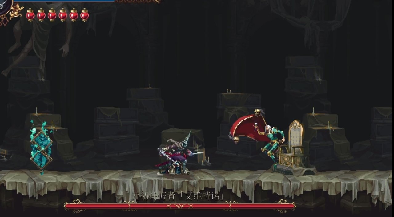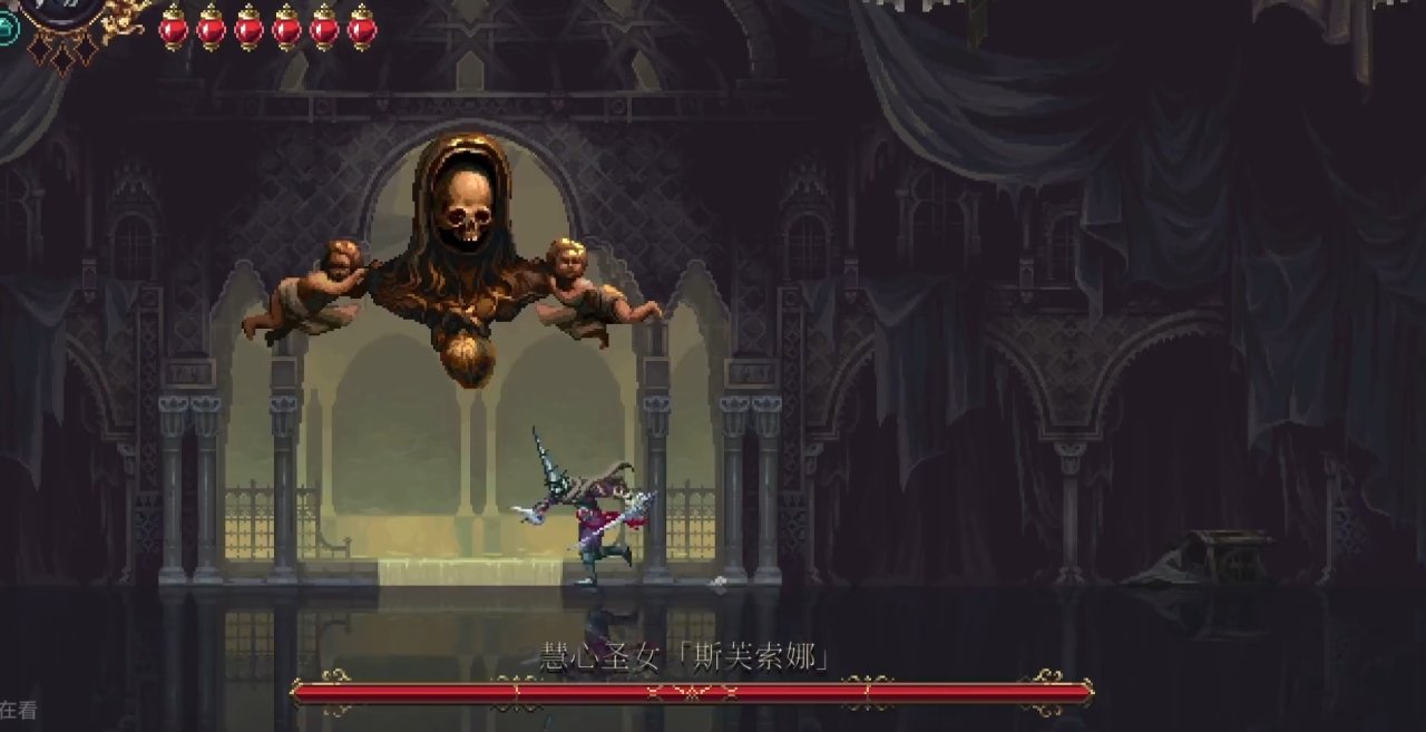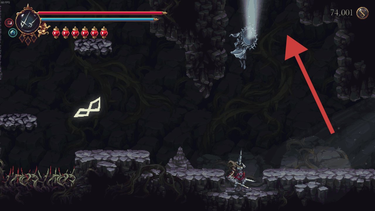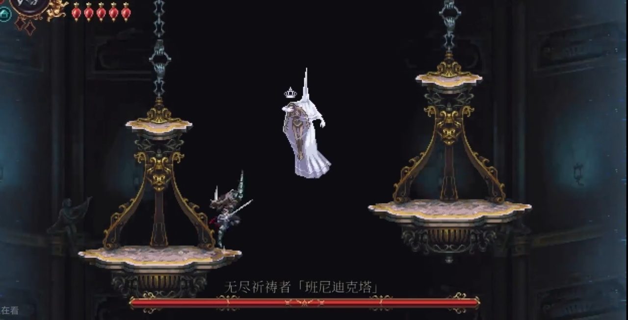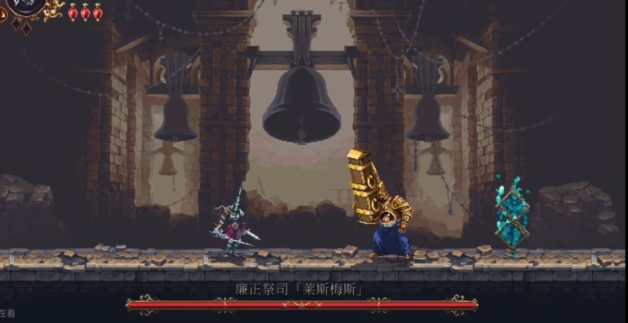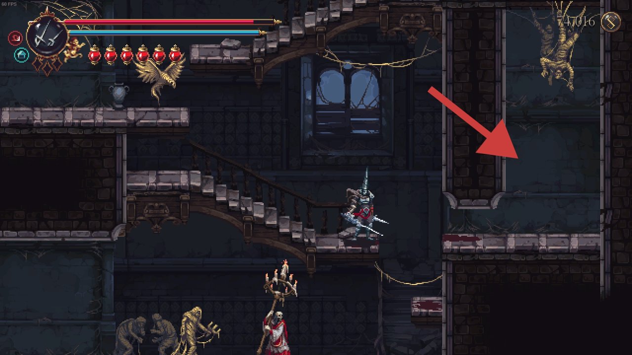 需要解鎖二段跳和雙劍後才能打到鏡子,上去後修女在右邊
