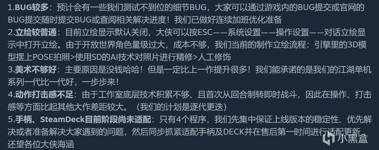 很少有製作組會在產品界面談論自己遊戲的不足之處,但如果你現在打開下一站江湖2的steam界面,你會發現白玉京工作室非但沒有避諱自己的作品目前存在問題,甚至還在遊戲介紹的開頭把各個問題的具體表現形式、以後如何解決事無鉅細地分條列舉了出來。