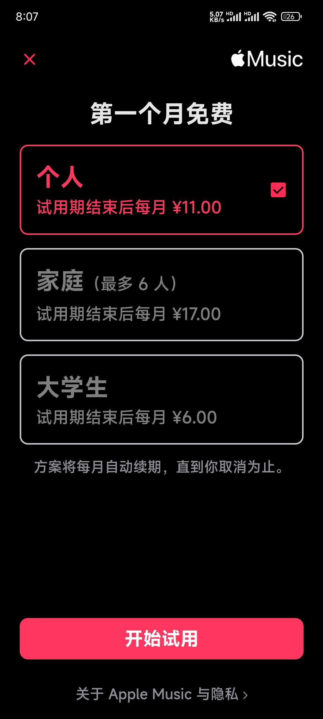 既然都嘗試Spotify了,自然蘋果音樂也要看一下,其實之前有在同學的電腦上用過,當時在跟他閒聊,然後給他推薦歌曲,歌單大部分都能找到,但也有個別歌曲是找不到的,雖然Apple Music有硬性入門要求,就是你開通服務後纔可以進行收聽和下載,但是大學生認證一個月才六塊錢,所以相較來說還是挺划算的