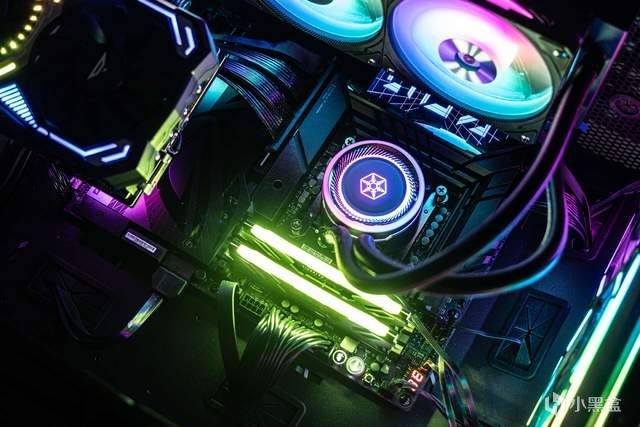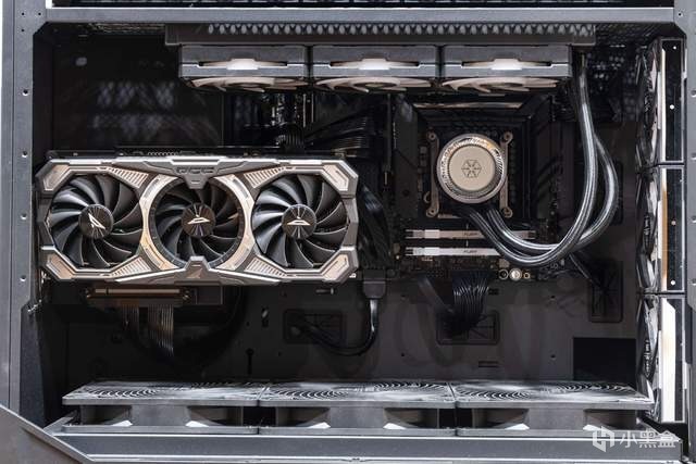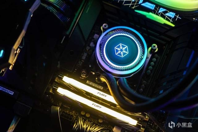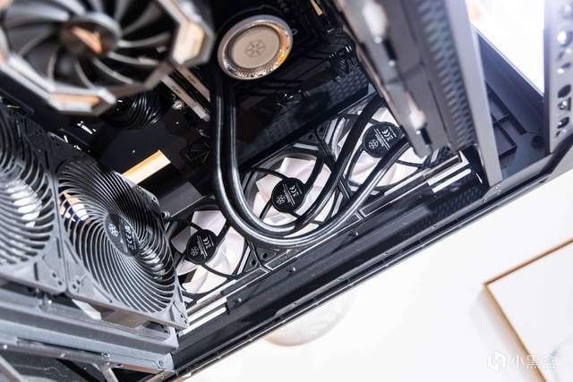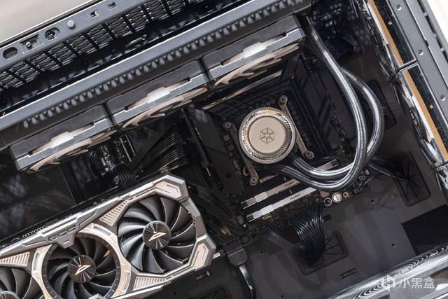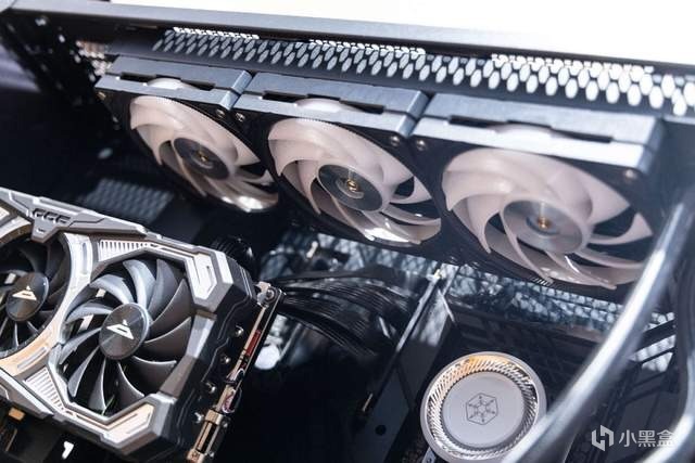 水冷方面,她安裝的是一套銀昕SilverStone星輝360水冷,冷頭顏值不錯,開燈效果很帶勁。根據機箱頂部預留的空間來看,夾漢堡也是非常輕鬆就能實現。