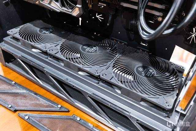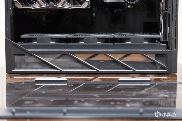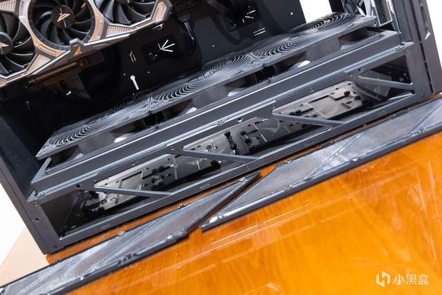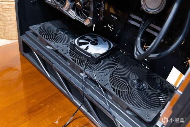 機箱底部空間非常巨大,支持安裝最大560mm的冷排。出廠時,銀昕SilverStone已經給ALTA F2標配了3把AP184i-PRO穿甲彈風扇,可以爲通過引氣口爲機箱引入大量氣流,提升機箱整體散熱性能。