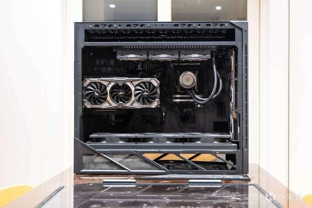 銀昕SilverStone ALTA F2全塔機箱採用了目前主流的全景房設計,擁有巨大的內部空間和優秀的垂直風道設計。豎裝的顯卡是前傾了11.3度,識別度相當高。機箱底部誇張的抬高距離可以更好提供底部進風,優化機箱內部煙囪效果,讓我不禁想起了當年經典的銀昕SilverStone烏鴉系列。
