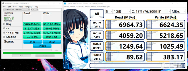 硬盤實測讀寫速度爲6964MB/s,6624.35MB/s。