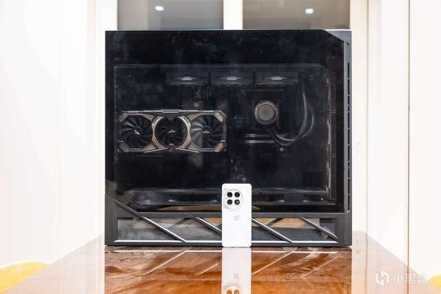 機箱的尺寸是非常巨大的,261mm(寬)x576m(高)x658mm(深)的機箱放在我80cm的餐桌上滿滿當當,這裏放了一臺6.8英寸的手機做下對比。
