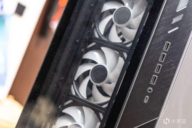 機箱的IO面板設置在機箱正面側面,提供了電源鍵,重啓鍵,多功能指示燈,4個USB3.0,一個3.5mm二合一音頻接口和一個USB 3.1 Gen2Type-C接口。按鍵位於機箱中上位置,不管這款機箱放在地面還是桌面上,都能輕鬆觸手可及。