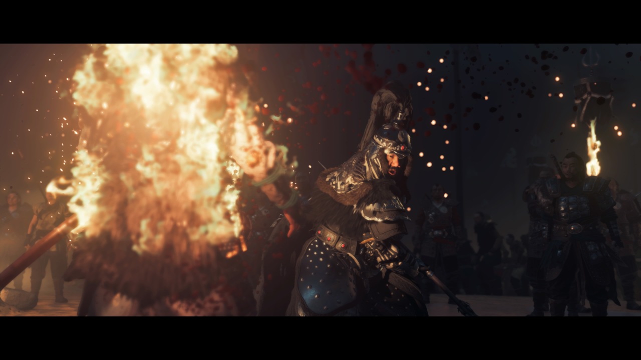 志村大人派遣對馬的最強武士安達前去對峙,一種表演型的迂腐戰爭形式盡收眼底。眼尖的玩家也許還在仔細對比着安達武士與赫通汗鎧甲工藝上肉眼可見的差別。卻不料一個照面間,一臉疑惑的安達大將便被蒙古人的烈火吞噬,隨後刀光一閃,人頭落地。