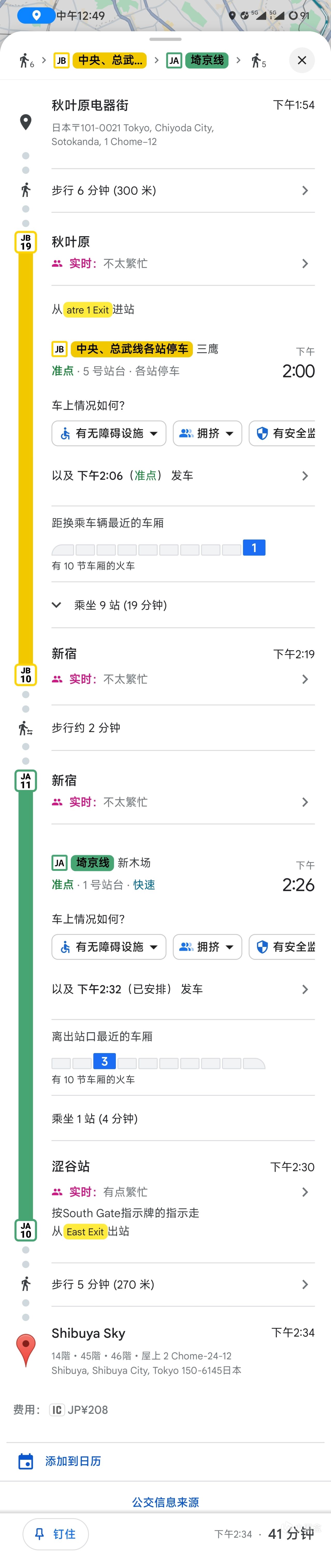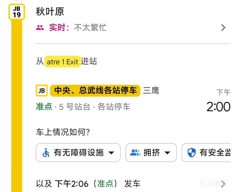 以秋叶原到涉谷为例,"JB"或者颜色就代表你要乘坐的线路,两者都可以做参考,而“JB19”里的19就是车站代号,Google map会告诉你从哪个入口进站,几点发车,以及在哪个站台候车。这个非常重要,正确的顺序就是,先按线路代码进站。再根据线路代码指示牌下对应的站台号码前往对应站台,等候发车时间对应的车。切记不要到了站台就上车,有些站台会有多个目的地的车,上错了就GG咯