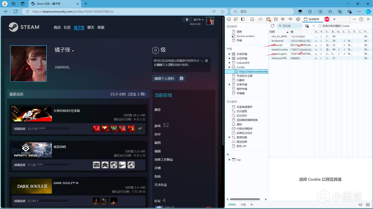 6.接下来找到我们所需要填的两个空,sessionid和steamloginsecure,分别双击我画勾的地方,Ctrl加c复制,再ctrl加v粘贴到软件的空里。(这应该是账号信息吧,我也不太懂,尽量别泄露)