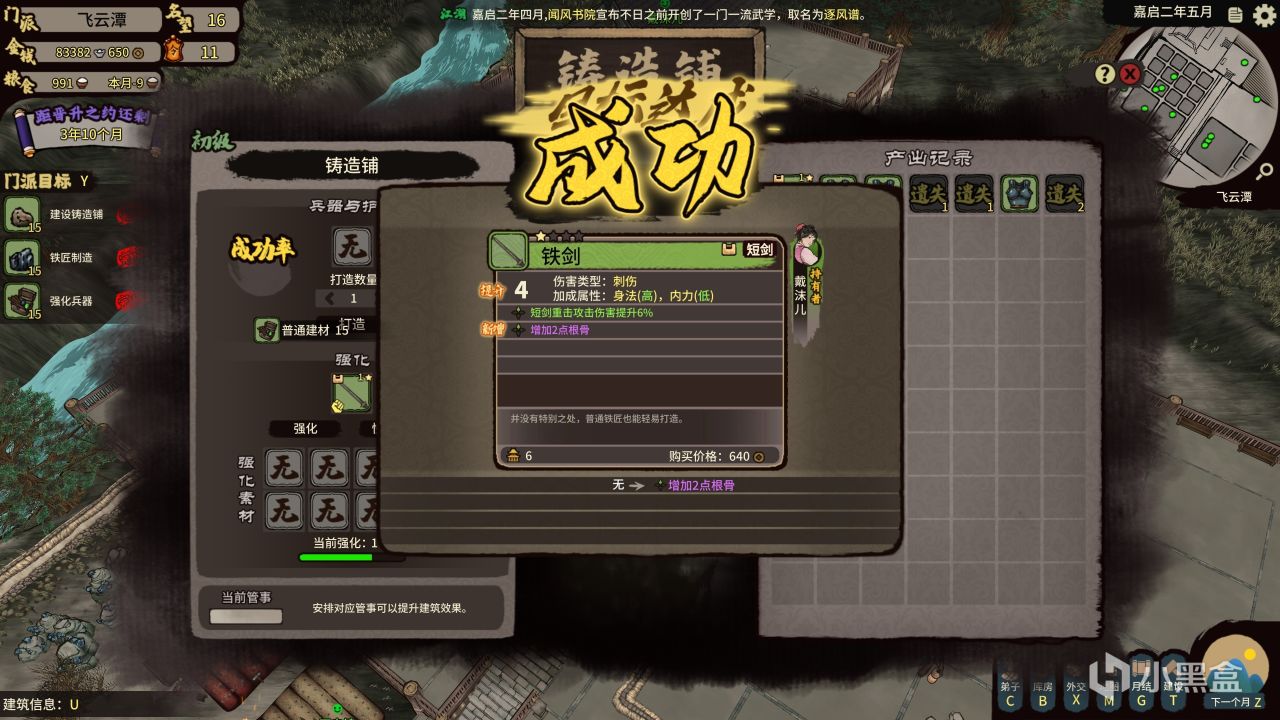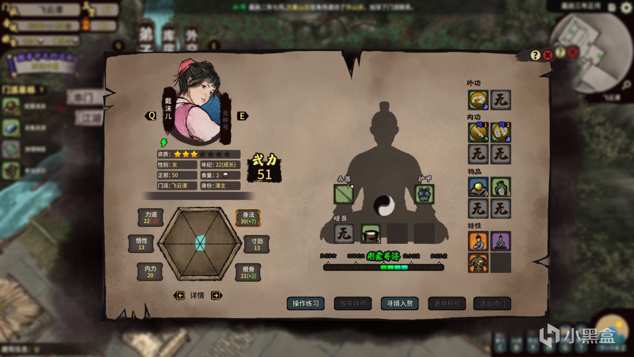 在前期时,大多招募而来的弟子均自带一门武学,拉高基础属性与装备质量是最快提升实力的方法。