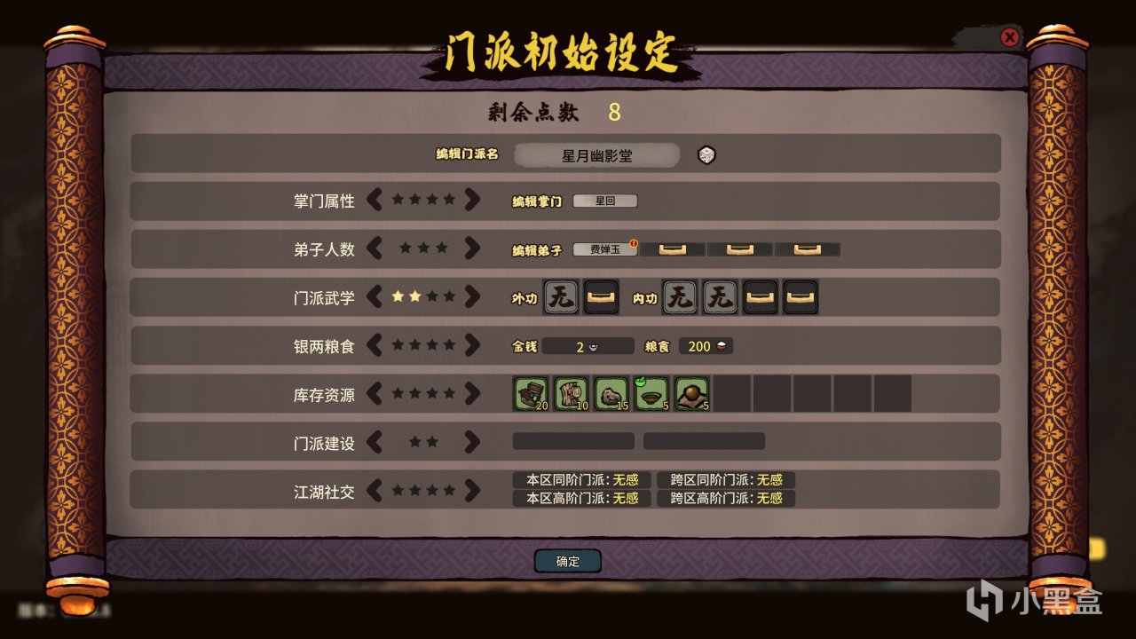 在创建门派的页面中,《江湖录》给到了七大类选项,其中一颗星代表着一档,玩家初始会获得十颗星。