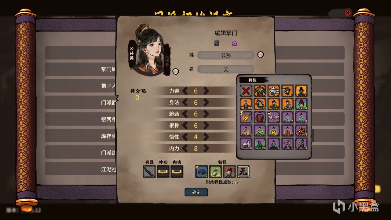 在掌门与弟子的个人页面,你还能够在随机属性的基础上进行加点、武器选择、天赋选择等自定义选项。