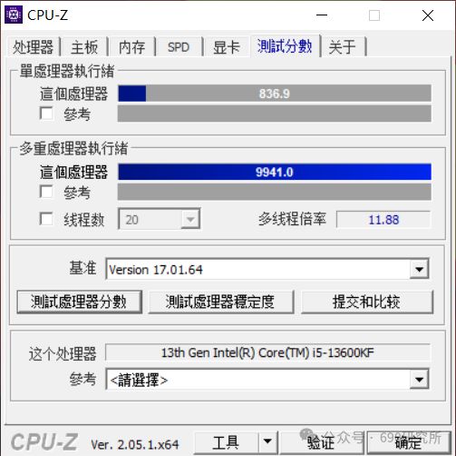 在默認狀態下,CPU-Z跑分在單核836.9分,多核心9941分,是正常的13600KF的跑分成績。