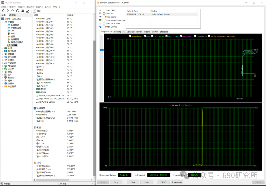 降壓後我最關心的還是發熱和功耗表現,AIDA64單烤FPU測試下,大核心溫度在60~64度,小核心下降到了58度,這個溫度表現比默認狀態下好太多了,冷排風扇的轉速也明顯降低了,到了1442 RPM,噪音控制也比默認狀態下好一些,電壓下降到了1.092V,功耗只有116.89W。