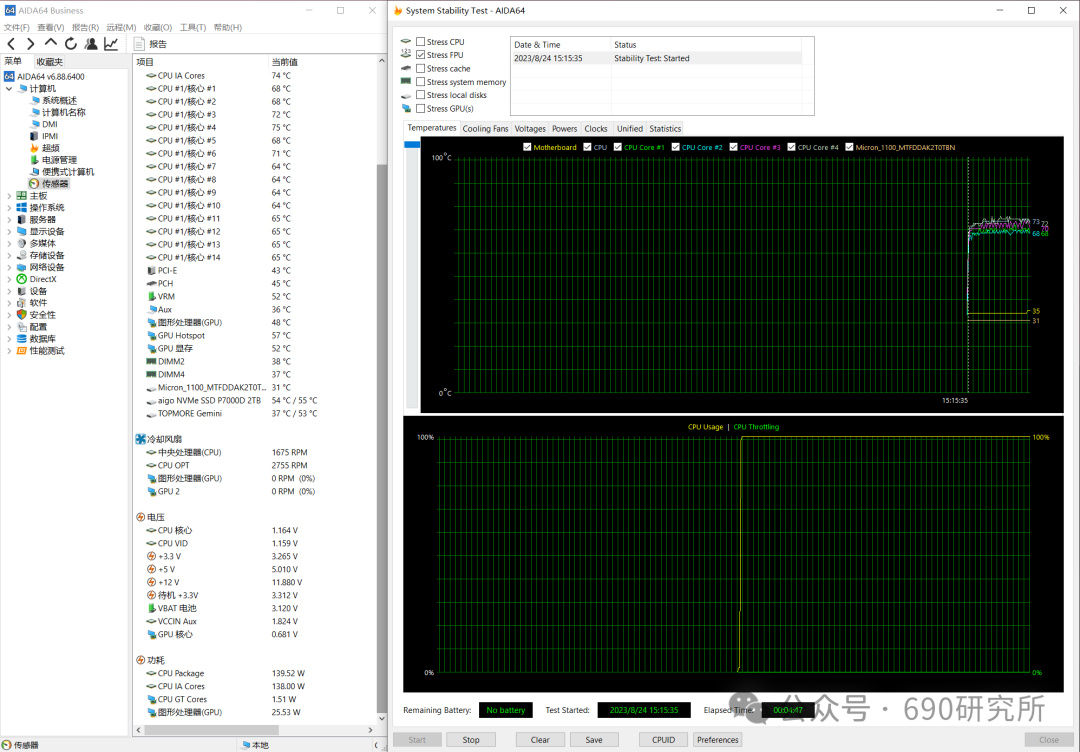 在默認狀態下,AIDA64單烤FPU,CPU核心電壓在1.164V,CPU功耗在139.52W,CPU冷排風扇轉速在1675 RPM,大核心溫度保持在68~75之間,小核心在64~65之間,太熱了太熱了,這還是360水冷的表現,我不滿意。