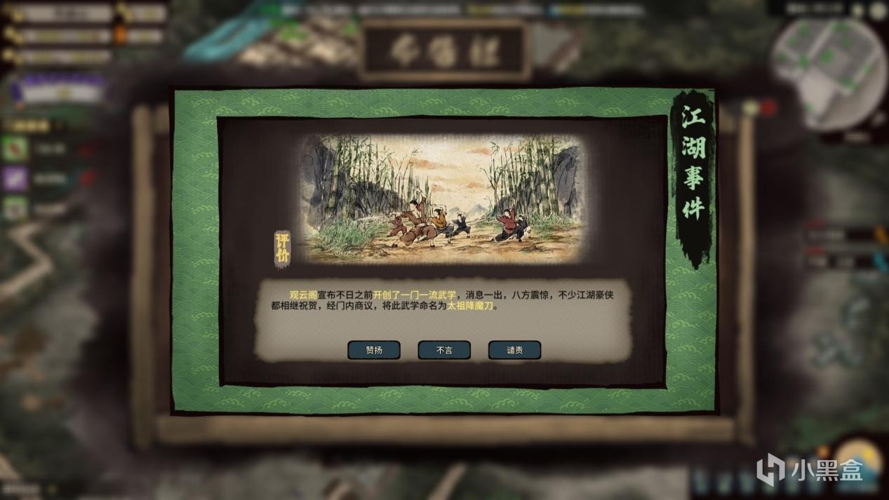 目前遊戲初步搭建了一個武林世界,不管是酒館偶遇江湖人士的彼此吹捧,亦或是鏢局走鏢和密室尋寶,可以看出製作組是深諳武俠小說的特徵。
