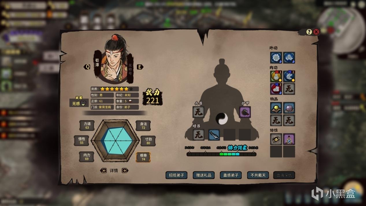 門派運作以及日常資源產出都需要一定數量的弟子,通過聚賢堂來招募心儀的弟子,並根據他們的特性來把他們放在合適的位置上。