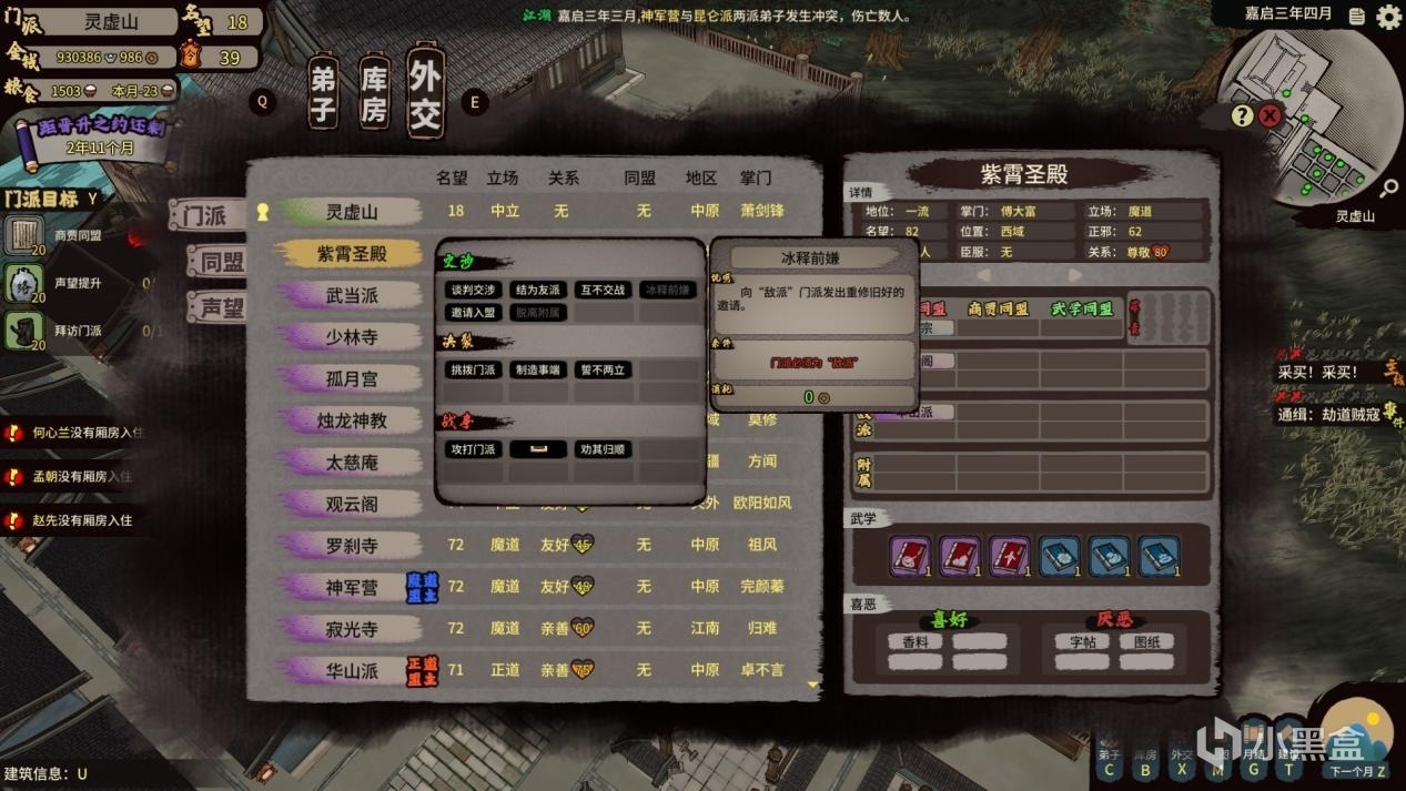 舉個例子,在門派解鎖煉丹房和鑄造房之後,玩家需要配方纔能解鎖更高級的武器丹藥,此時就可以向擁有這些配方的門派發起交易請求,當月發起提議,次月月初會提示是否交易成功。如果有足夠的金錢,基本上可以實現奢侈稀有資源全進口的模式,目前來看只要達到公平交易,門派AI就會達成提議。