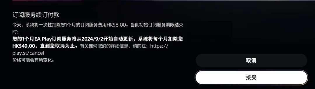购买了这8港币每月EA PLAY会员后,下个月juicy自动续费,扣除HK$49.00。所以购买后一定要取消自动续费。
