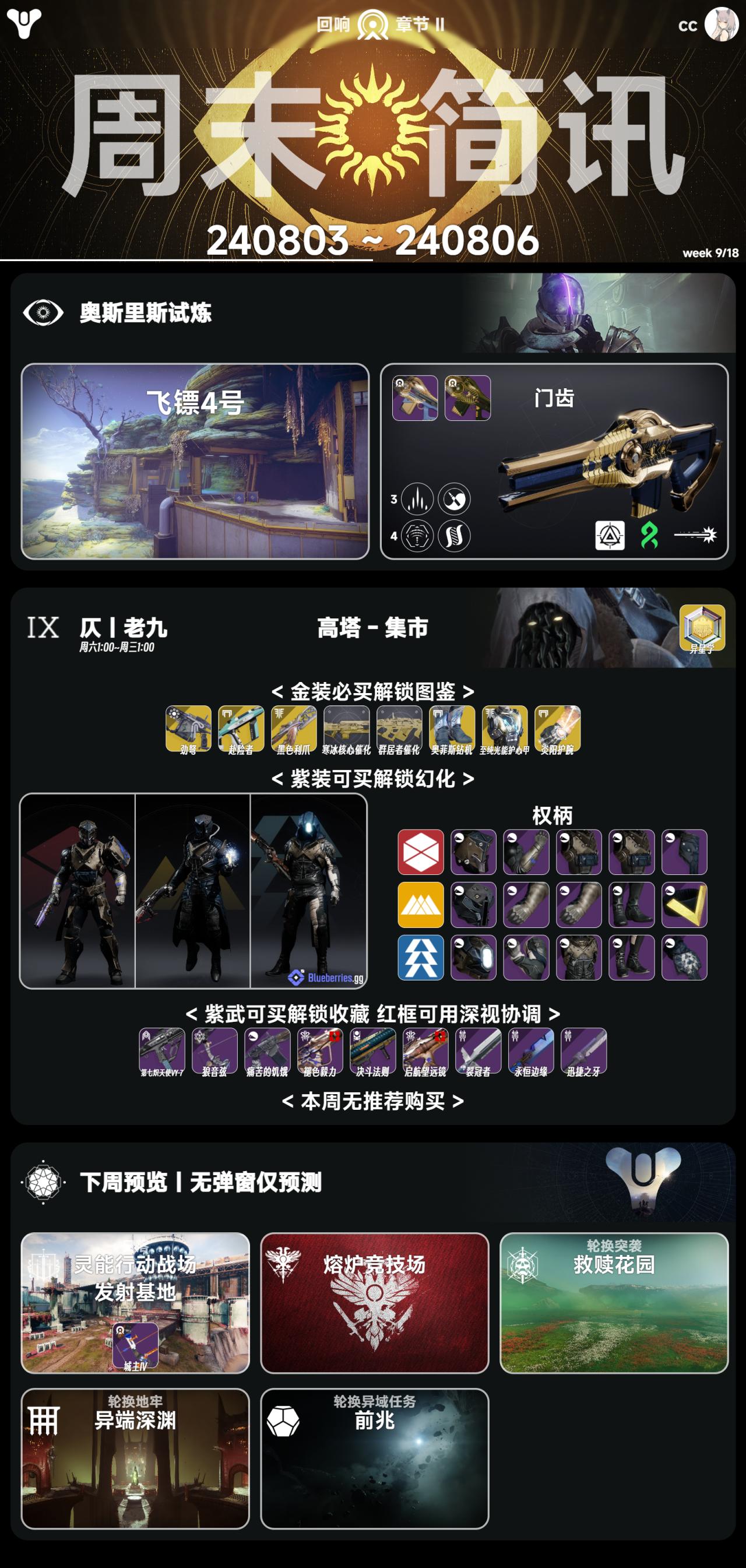 【命運2】週末簡訊240803|試煉門齒|老九|下週二至點