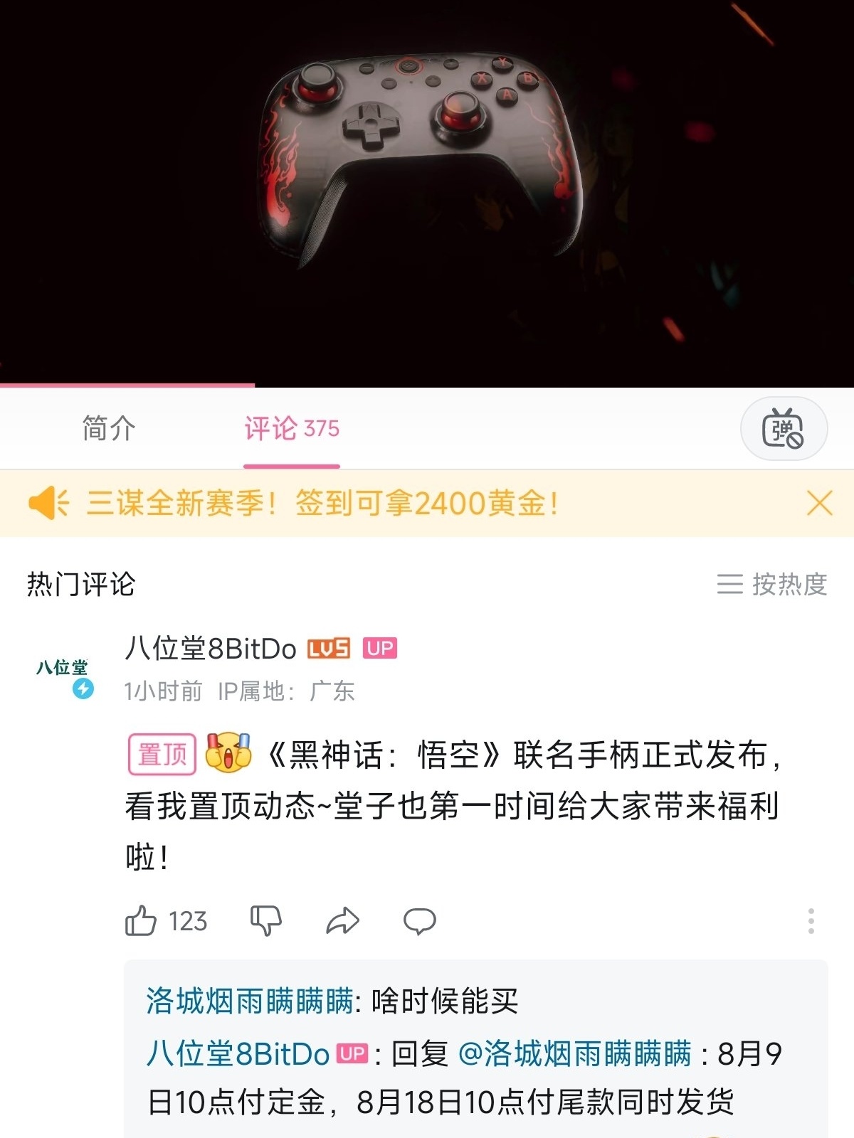 而八位堂也在自己的官方賬號發佈了與黑神話悟空的聯名手柄,雖然未同步商場界面,不過發貨時間相較飛智提前到了8月18日遊戲發售前。
