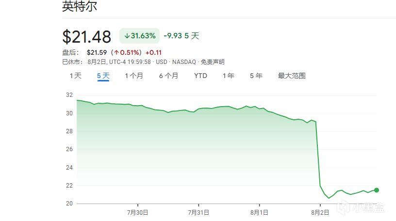 Intel股價暴跌28%,一度跌破21美元大關。目前,股價約爲21美元,未見反彈跡象。