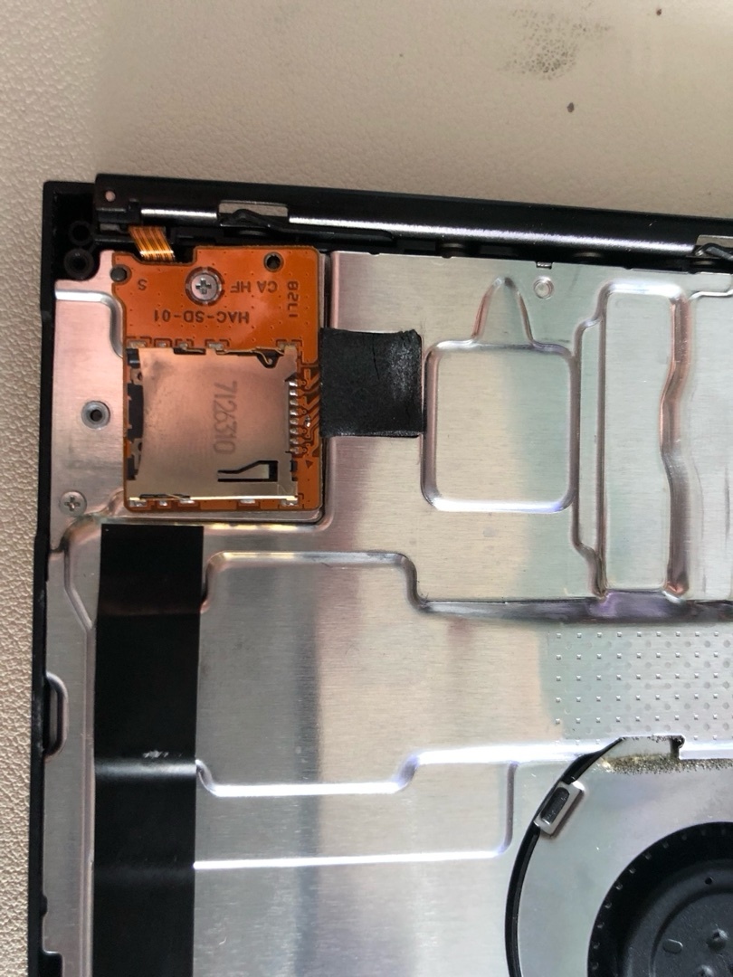 注意此部分的TF卡槽,拆除方法是先將螺絲擰下後,將卡槽向上抬起即可,拆除時可能會有點粘連,此時要慢慢的將其托起,直到黑色部分插槽與主機脫離。 //注意不要暴力脫出,可能造成卡槽的損壞