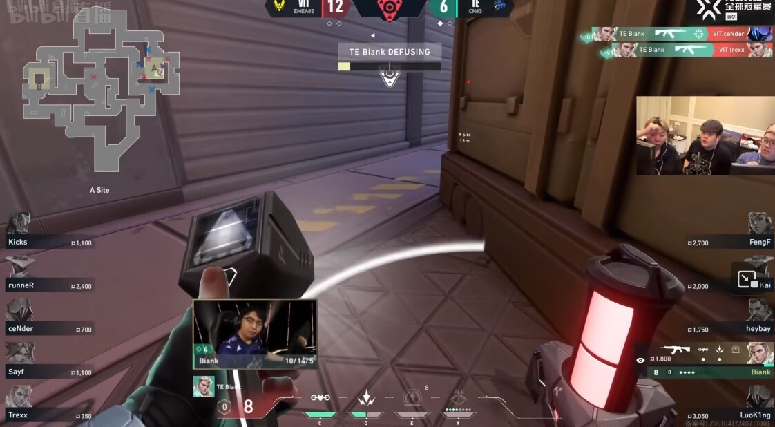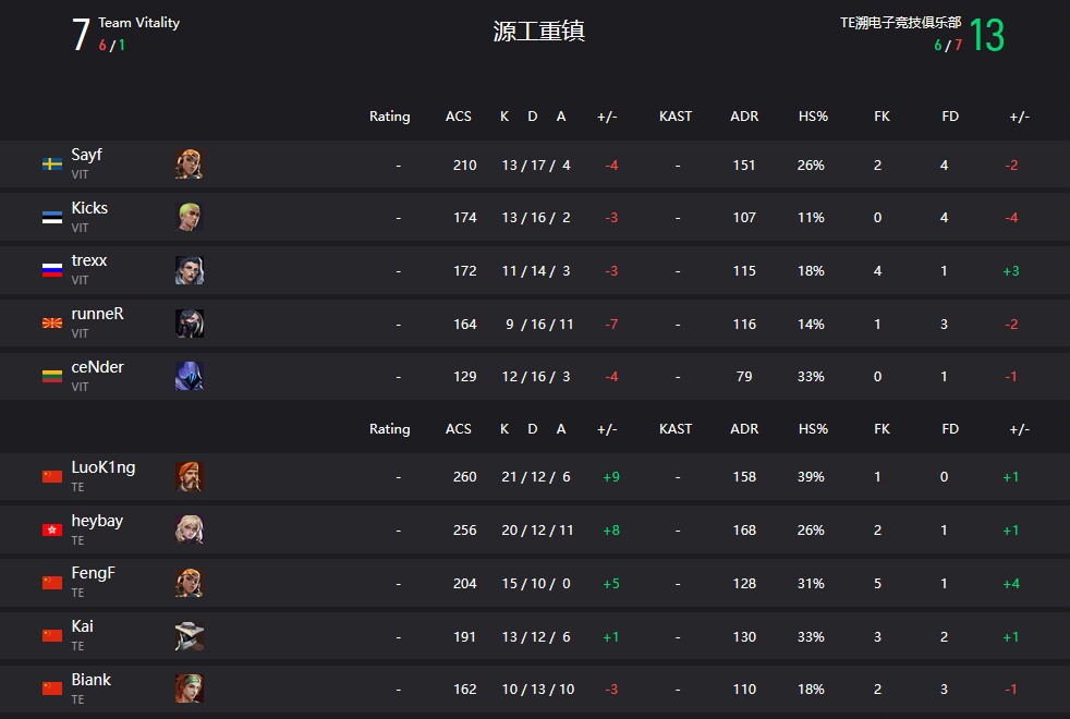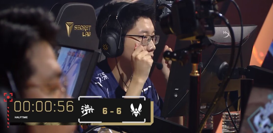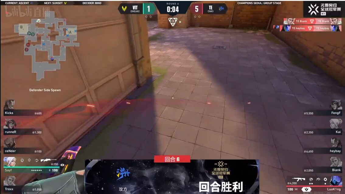 TE输掉了手枪局,连丢几分,开始艰难时刻,比分逐渐拉大一度来到 TE 1-5 VIT ,好在TE调整状态,不断打出反清套餐开始缓慢追分。4-5回合,TE双大招0收益输掉一局,但是Louk1ng还在发挥三杀兜底,最后6-6双方平分进入下半回合,加油啊。