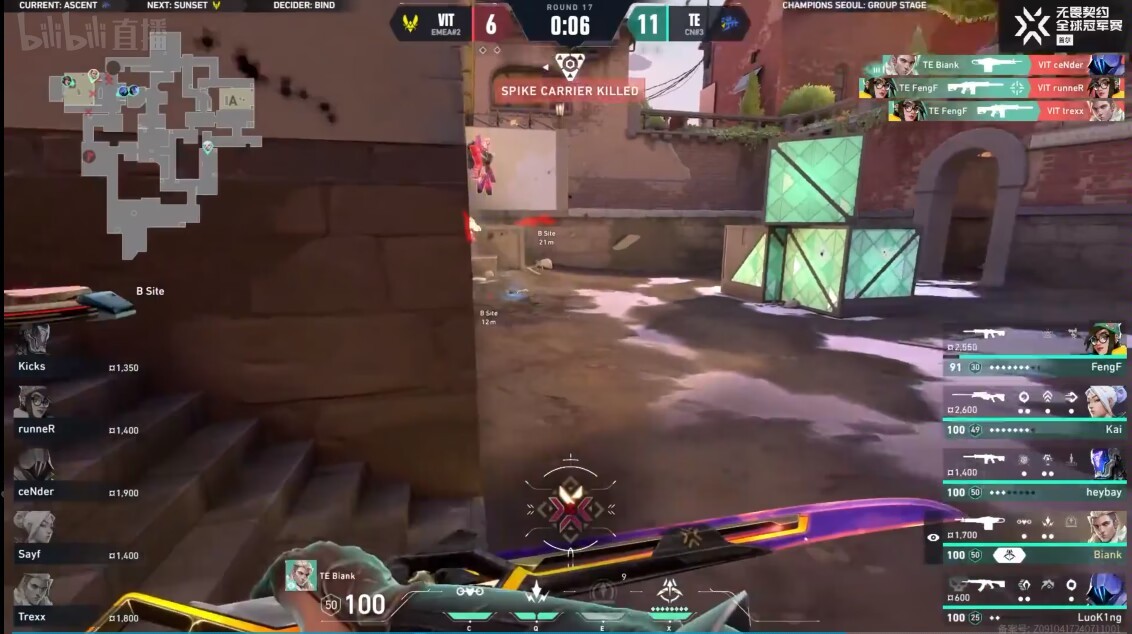 TE防守方再胜手枪局再拿两分,更是预判出VIT的假打策略,kai起到大狙再次打炸VIT经济,比分 TE 11-6 VIT 并打出VIT最后的暂停,TE大狙奥丁依旧发挥,这就是B点猎枭奥丁啊,这就是kai的大狙!