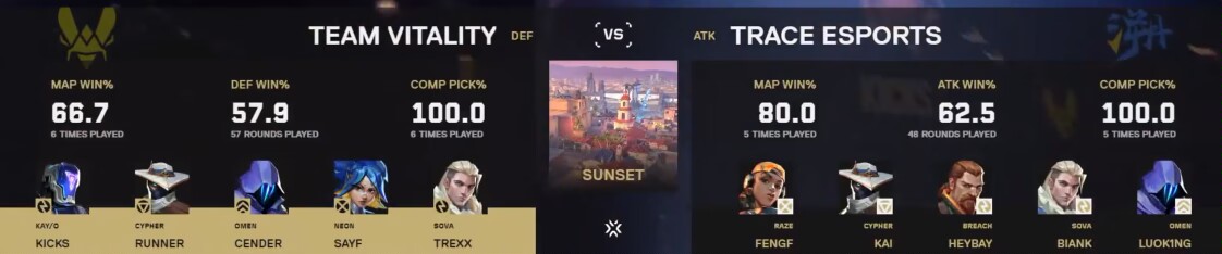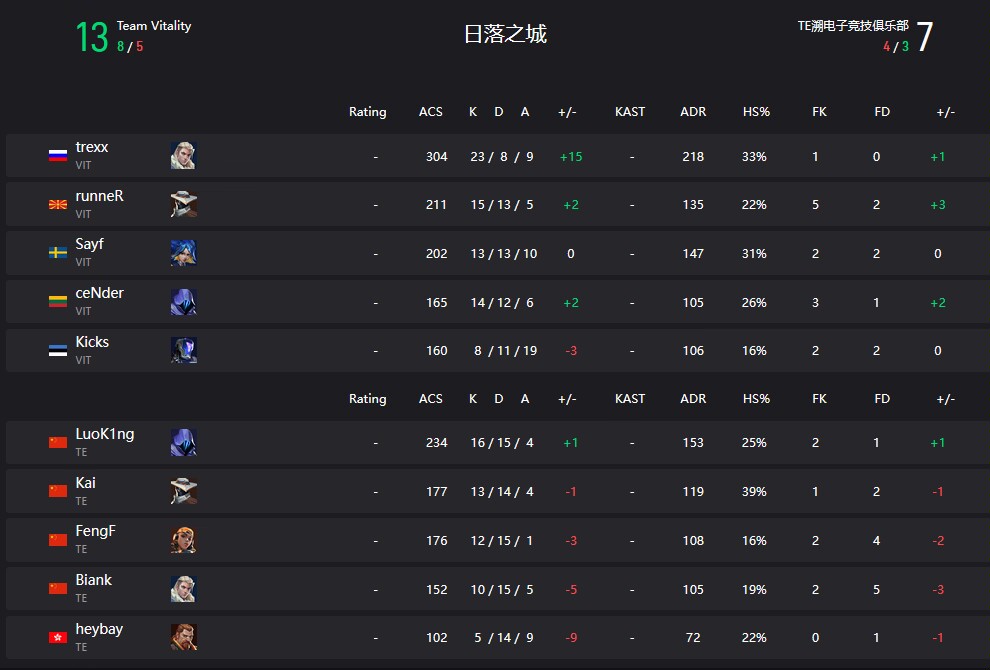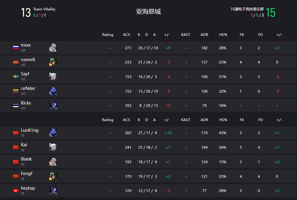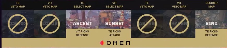 VIT 中路快攻让TE没有预警陷入人数,但FengF雷兹进点发力反而赢下了手枪局,TE进攻章法十足,技能配合完美,再度进攻领先,但VIT经验十足不断追分,双方你来我往,难解难分,双方 3-3 战平 TE率先叫出暂停,可惜VIT使用放包点回放战术,TE连丢几分,不愧是把TH按着打的日落之城。