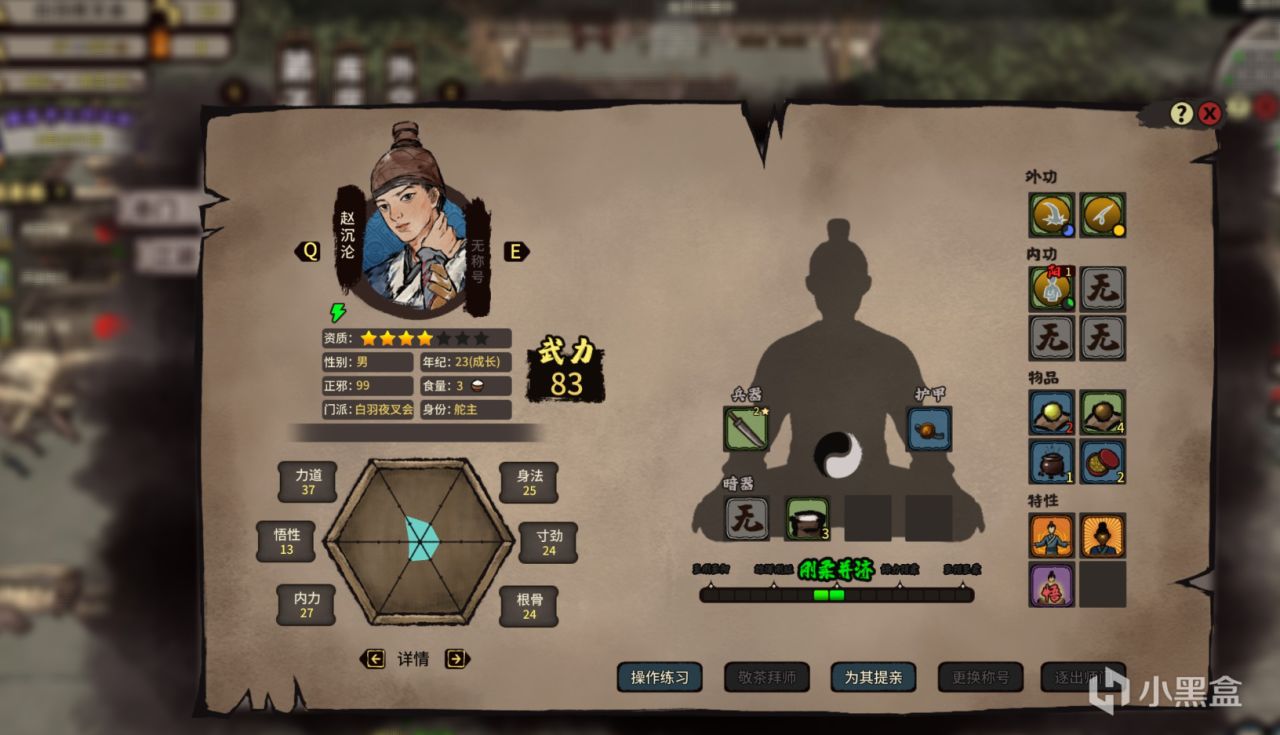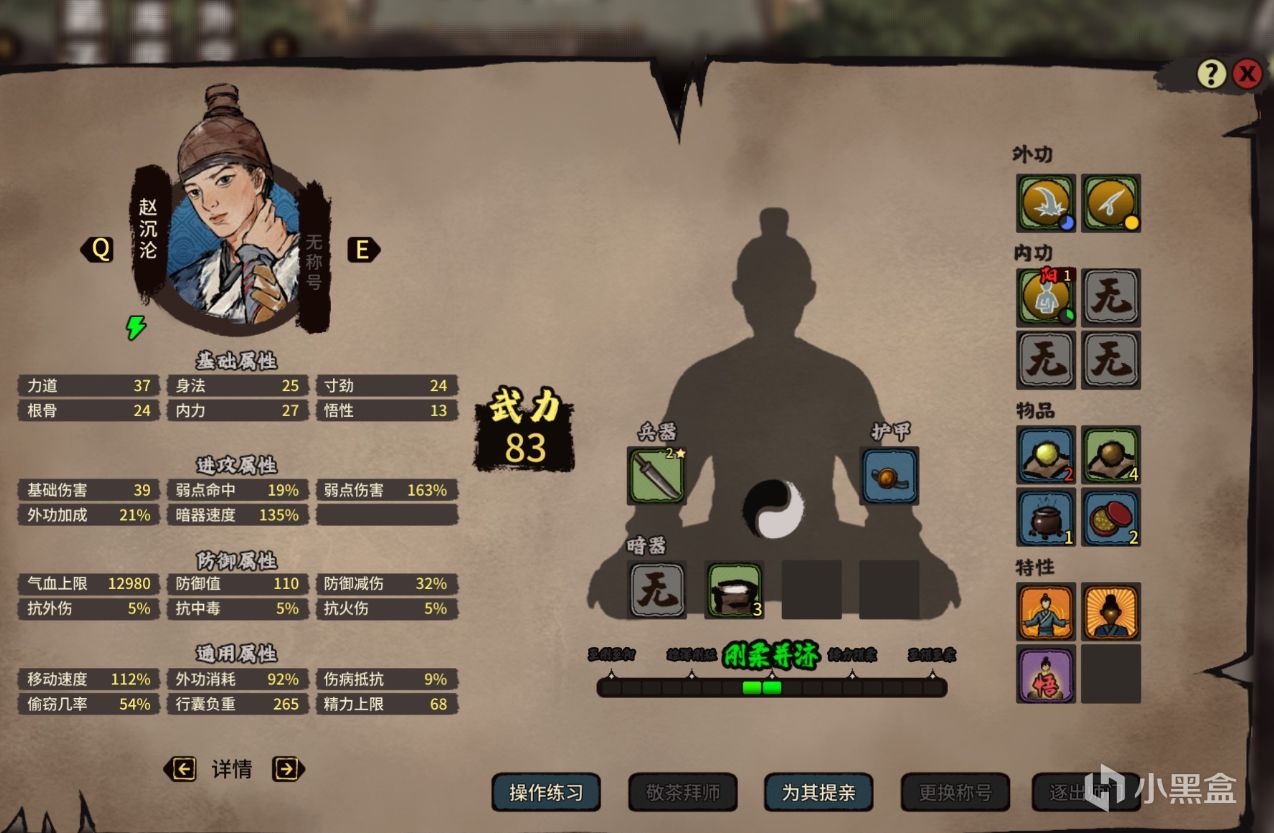 影響人物武力值的指標就藏在創建角色時的那幾種屬性裏,即:力道、悟性、內力、身法、寸勁以及根骨六項。它們影響着人物的血量、修煉速度、藍量、弱點傷害以及移動速度等方方面面。