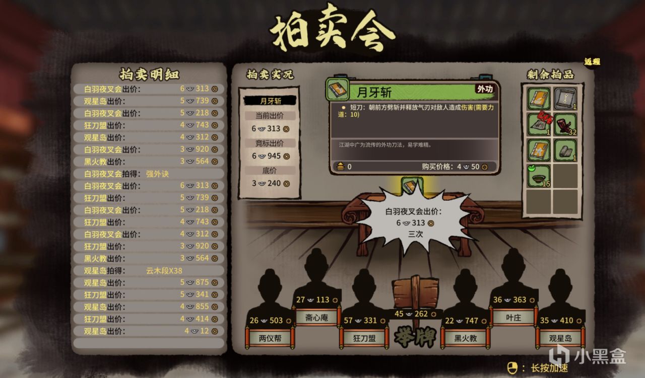 拍賣事件:好東西,絕對的好東西,前提你得有錢纔行。對於一羣能將野外最常見的木材—價值幾百銅錢的“雲木段”活生生喊價到4兩銀子的弱智,我的意見是,除非你很需要某件內功或外功書籍,否則別去閒逛。