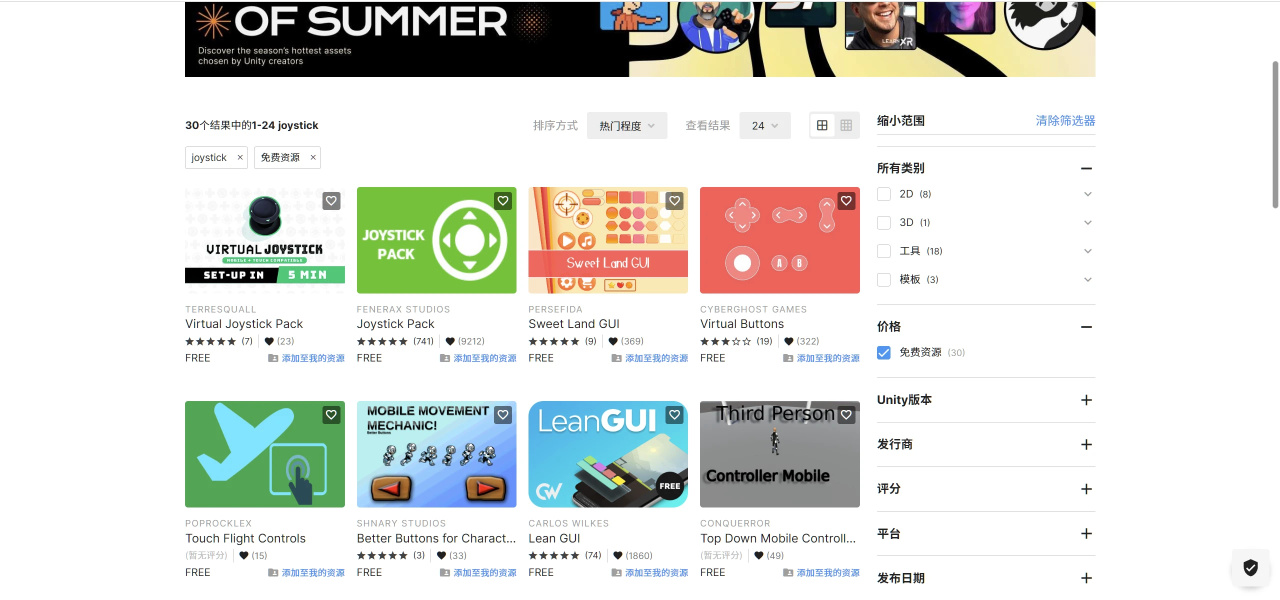 在Unity资源商店中有非常多现成的资源可供开发者使用(美术素材、功能插件、音乐等等),我也是连忙在资源商城中搜索了“Joystick(游戏摇杆)”: