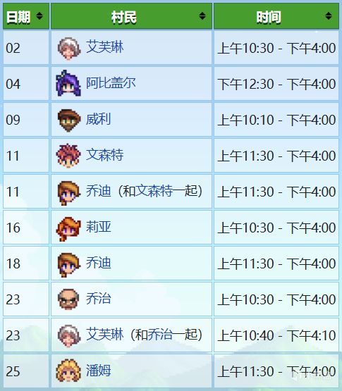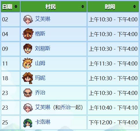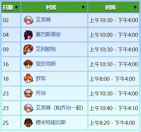 在工作日,謝恩每天早上8點到下午5點在Joja超市工作。。山姆每週一和週三中午12:50到下午5點打掃衛生。