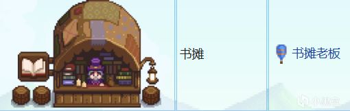 當書攤老闆來到小鎮時,早上起牀時會出現“書攤老闆今天在鎮上”提示,在皮埃爾的雜貨鋪右上方也會出現一個標牌。書攤全天開放。