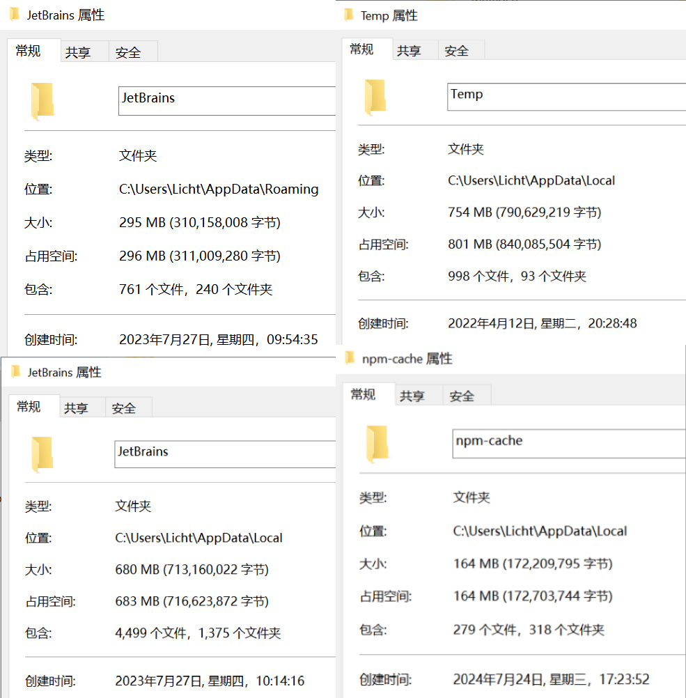 对于我来说以上文件夹都可以清理,因为我已卸载 jet brains 全家桶,npm 产生的缓存 cache 也可以安全删除,Temp 临时文件夹里的内容也可以安全删除(如果提示被占用可以跳过)。