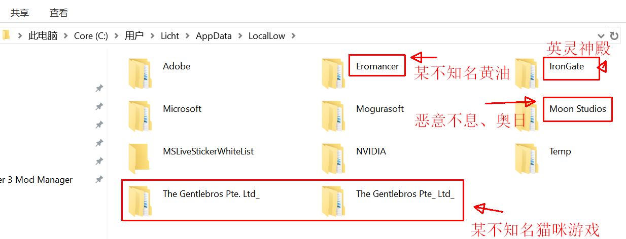 LocalLow:游戏存档常用文件夹,一般是“作者 / 厂商名称”