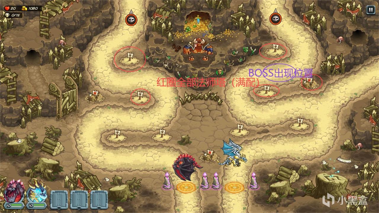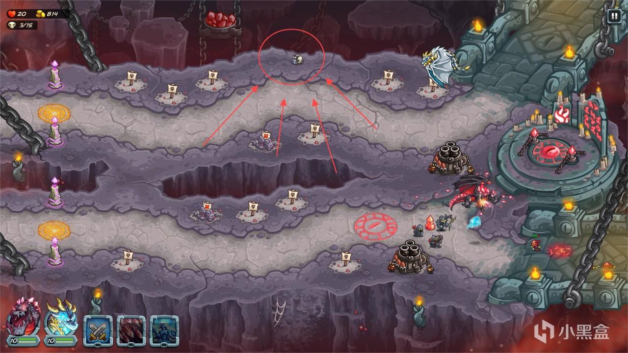 51.纠缠不清不可能难度下在在血辗BOSS跳跃前击败它,他的跳跃点在第一个转弯口,那我们需要秒掉他,就需要满配的三座法师塔+双龙骑脸。(参考下面的图,BOSS的起始点我给大家标出来)