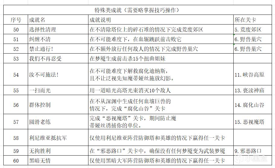 一个是只使用利尼维亚势力的防御塔和英雄,另一个是只使用黑暗大军势力的防御塔和英雄,这里教大家一个技巧,只要你带上了阵容,就算你打的是铁拳模式限制特定防御塔通关,一样可以触发成就。