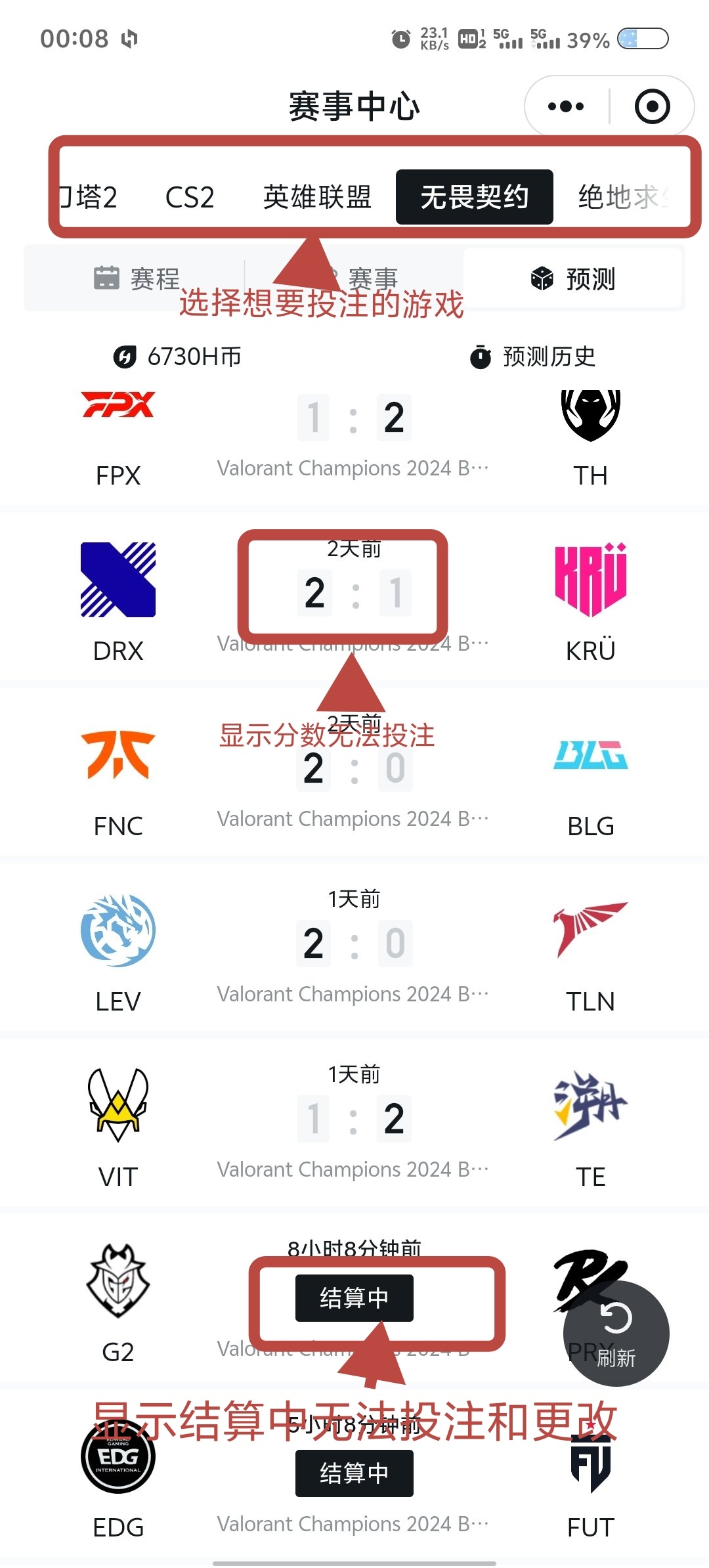 你可以看到這些遊戲的比賽,如果顯示比分了,那麼就無法去投注了,還有顯示結算中也無法投注或者更改,只有預測中才可以投注和更改。