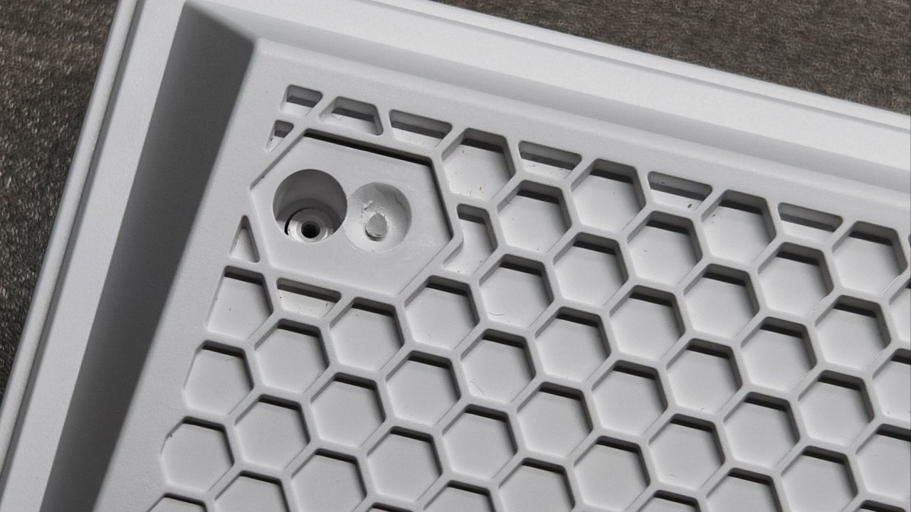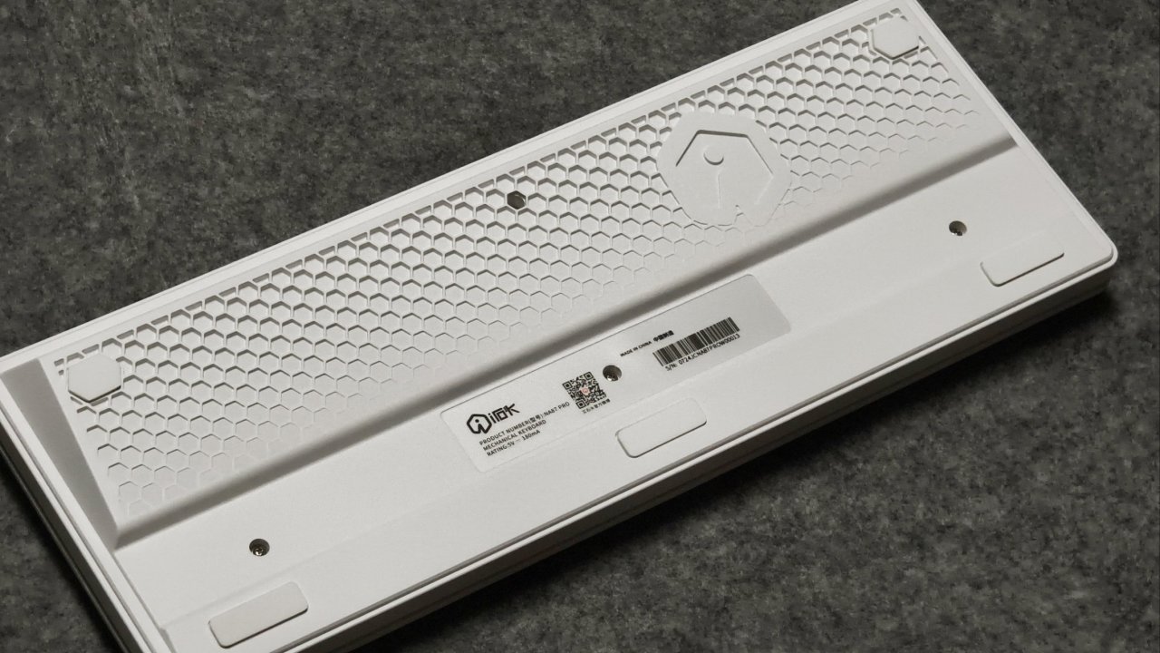 我们再看看键盘的一个底部,你可以看到他取消了常规的二段式脚撑,上半部分变成了一个蜂窝状的渐变设计,右上角还有艾石头家的LOGO。说实话我目前玩那么多键盘,大部分厂商他们的设计点最多都在键盘正面,底部的设计他们是不怎么在意的。当然有肯定也是有的,但那些基本都是在铝铊铊或者四五百的键盘上,低价位的键盘我确实没发现有哪家厂商有专门在背部做一个设计的。艾石头这个很明显还是有用❤️的,值得好评