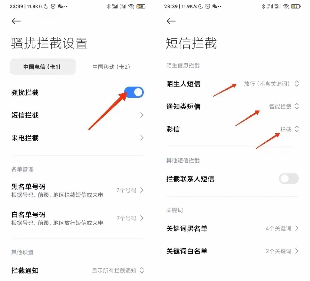 確保騷擾攔截這個功能處於開啓狀態之後,再進行後續的設置。通常來說,手機系統都設置了多種模式的攔截方案,比如陌生人短信攔截、通知類短信攔截、彩信攔截、關鍵詞攔截等。