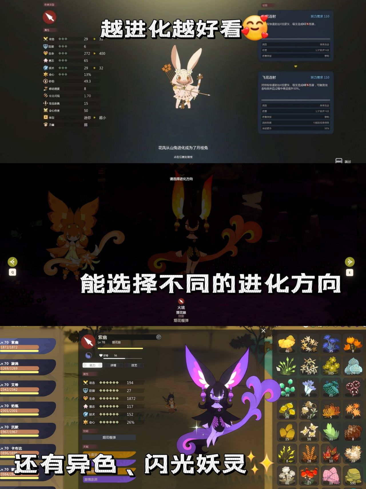 4️⃣妖靈達到一定等級後就有各種各樣的進化分支可供挑選,每隻妖靈都設計得很好看,越進化越是戳人心尖尖,用不同的道具還能進化出不同的形態,獲得不一樣的外貌和技能,可鹽可甜,猛猛滿足了玩家的花式喜好。
