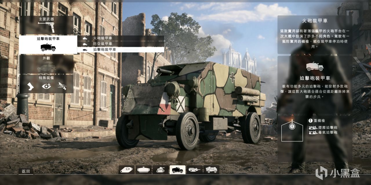 而迫擊炮裝甲車集合了重機槍,以及三門迫擊炮,並且移動速度很快,同樣可以在很遠的敵方限制敵方步兵