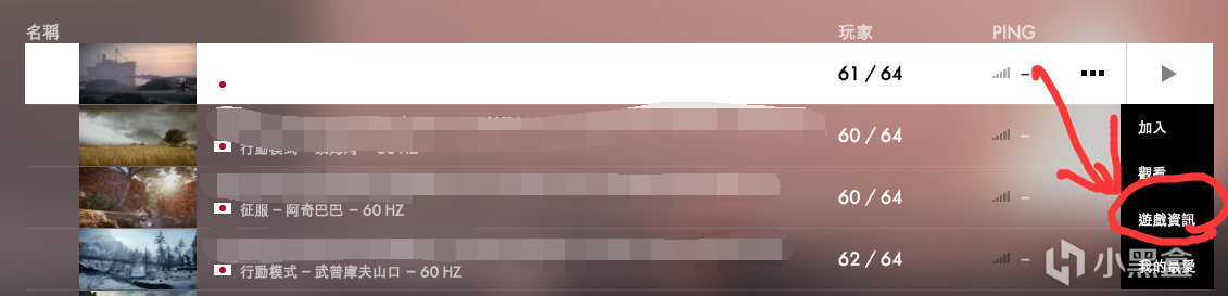 5.找到自己心儀的服務器後點右邊三個小點,然後選擇遊戲資訊