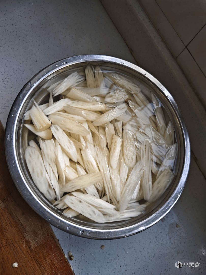 切面看起來很像藕,切完泡上水防止氧化。備上其他的菜之後把藕帶焯一下水就可以開始爆炒了。